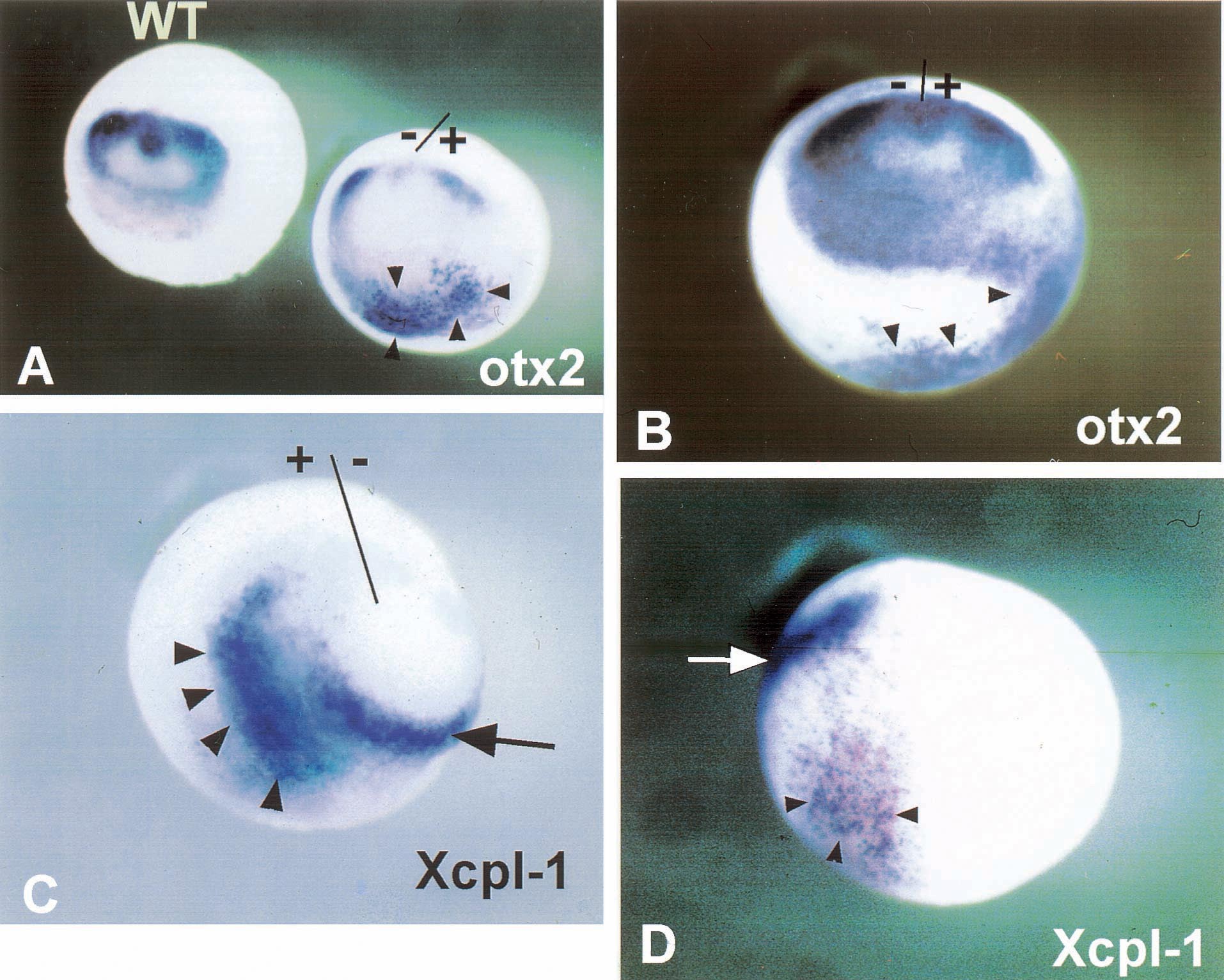 Xcpl-1 expression. Again, ectopic Xcpl-1 expressing cells (marked by arrowheads) are localized to the injected side. Endogenous Xcpl-1 expression is