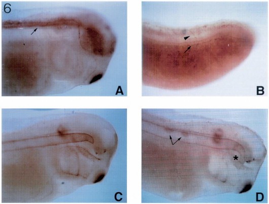 Fig. 6. Whole-mount immunostaining with N-CAM and Tor-70 antibodies revealed defects in neural tube and notochord formation after overexpression of Xcadherin-11. (A,B) Embryos stained with N-CAM antibody. (A) Uninjected control embryo. (B) Embryo injected with 700 pg Xcadherin-11 mRNA: in addition to severe defects in eye, brain and sucker formation, the embryo possesses a very small neural tube (arrow) which is localised more ventrally compared with the control, nerve fibres appeared normal (arrowhead). (C,D) Embryos stained with Tor-70 antibody. (C) Uninjected control embryo. (D) Embryo injected with 350 pg Xcadherin-11 mRNA: the notochord was elongated and kinked in the direction of the branchial arches (asterisk), additional Tor- 70-positive vesicles were formed along the notochord (arrows).