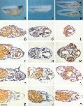 Fig. 5. Posteriorised phenotypes resulting from injection of Xcadherin-11 RNA at the dorsal side showed disorganised mesodermal and neural tissues. Left panel: embryos injected with 700 pg RNA, middle panel: embryos injected with 350 pg RNA, right panel: uninjected control embryo. (A,F,K) Embryos before paraffin embedding and sectioning. (BâO, except F,K) Transverse sections of embryos shown in (A,F,K). Transverse sections through the head region revealing amorphous brain structure (B,C,D), or eye anlage not separated from diencephalon (G, asterisk), fused somites (C, arrowhead), otic vesicle atypically thickened by neural tissue (D, arrow), missing notochord (C,D, arrowhead) or enlarged notochords (I,J). Transverse sections of the trunk region revealed very small neural tubes (E,J). Bar: 200 mm.