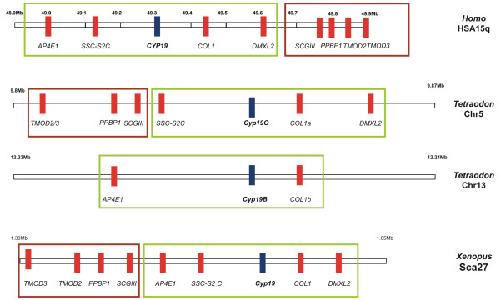 Figure 2. Physical maps of the genomic environment around CYP19 in Homo sapiens, Tetraodon nigroviridis and Xenopus tropicalis.