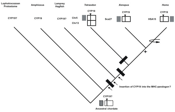 The cytochrome P450aromatase (CYP19), catalyses the aromatisation of androgens to estrogens, a key mechanism in vertebrate reproductive physiology. A current evolutionary hypothesis suggests that CYP19 gene arose at the origin of vertebrates, given that it has not been found outside this clade. The human CYP19 gene is located in one of the proposed MHC-paralogon regions (HSA15q). At present it is unclear whether this genomic location is ancestral (which would suggest an invertebrate origin for CYP19) or derived (genomic location with no evolutionary meaning). The distinction between these possibilities should help to clarify the timing of the CYP19 emergence and which taxa should be investigated. Here we determine the "genomic environment" around CYP19 in three vertebrate species Homo sapiens, Tetraodon nigroviridis and Xenopus tropicalis. Paralogy studies and phylogenetic analysis of six gene families suggests that the CYP19 gene region was structured through "en bloc" genomic duplication (as part of the MHC-paralogon formation). Four gene families have specifically duplicated in the vertebrate lineage. Moreover, the mapping location of the different paralogues is consistent with a model of "en bloc" duplication. Furthermore, we also determine that this region has retained the same gene content since the divergence of Actinopterygii and Tetrapods. A single inversion in gene order has taken place, probably in the mammalian lineage. Finally, we describe the first invertebrate CYP19 sequence, from Branchiostoma floridae. Contrary to previous suggestions, our data indicates an invertebrate origin for the aromatase gene, given the striking conservation pattern in both gene order and gene content, and the presence of aromatase in amphioxus. We propose that CYP19 duplicated in the vertebrate lineage to yield four paralogues, followed by the subsequent loss of all but one gene in vertebrate evolution. Finally, we suggest that agnathans and lophotrocozoan protostomes should be investigated for the presence of aromatase.
