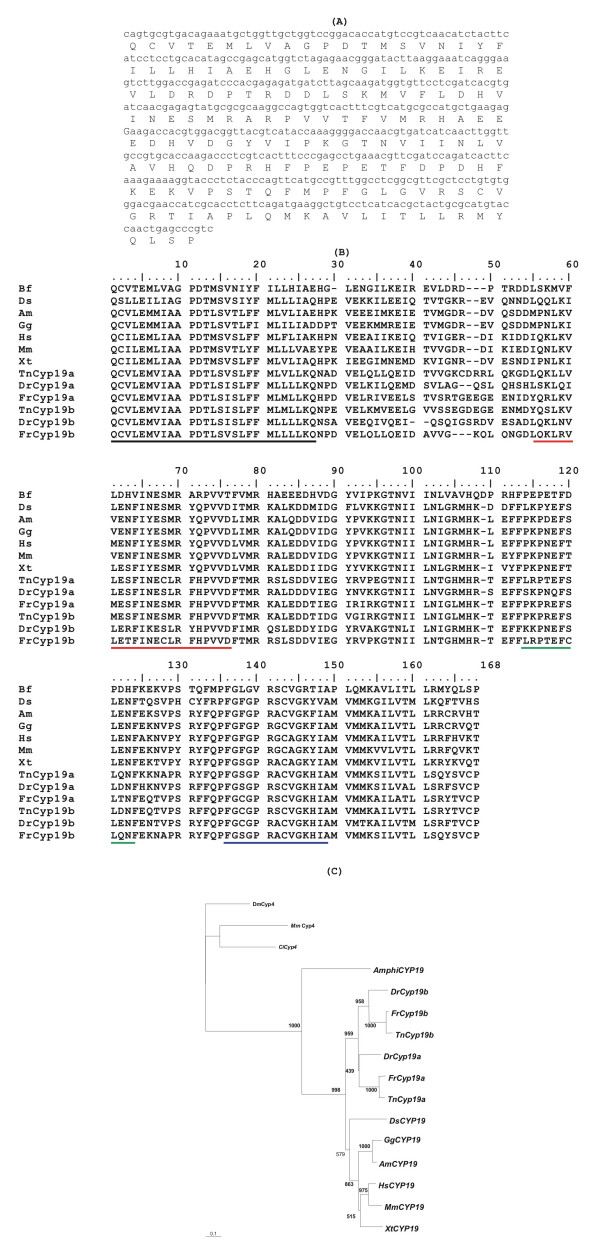 Figure 5. Nucleotide and predicted amino acid sequence of the AmphiCYP19 (partial sequence) (A); alignment of CYP19 sequences; dashes denote insertions; black line, I-helix region; red line, Ozol's peptide region; green line, Aromatic region and blue line, Heme binding region. Bf, B. floridae, Ds, D. sabina, Am, Alligator mississippiensis, Gg, G. Gallus, Hs, H. sapiens, Mm, M. musculus, Xt, X. tropicalis, Tn, T. nigroviridis, Dr, D. rerio, Fr, Fugu rubripes (B); Neighbor-joining phylogenetic tree from the alignment of the putative protein sequences of CYP19 genes, figures at nodes are scores from 1000 bootstrap resamplings of the data ; an insertion of the TnCYP19b predicted protein sequence was kept out of the alignment (C).