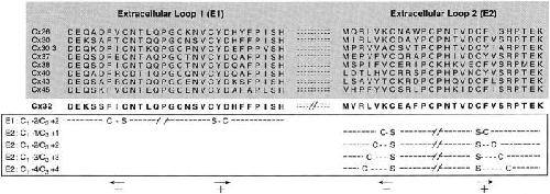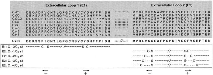 Figure 2. Schematic representation of the cysteine mutants tested. An alignment of selected mammalian connexin sequences for the two extracellular loops (E1 and E2) is shown (shaded) above the sequence of Cx32, which was the target of mutation here. Restriction enzyme sites used to create combination mutants within each loop (Fig. 3) and between loops (Fig. 4) are indicated (refer to Materials and Methods for details). Mutants leading to movement of the cysteines in E1 and E2 are illustrated, with appropriately marked arrows indicating the terminology for direction of the movements used in the text. |