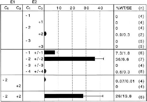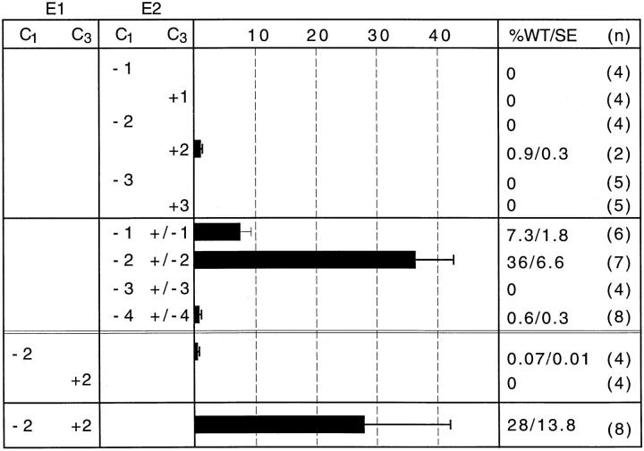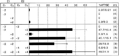 Figure 3. Functional analysis of single and paired movements of cysteines 1 and 3 within E1 or E2 of Cx32. Mutants of Cx32 in which cysteines 1 and 3 of either E1 or E2 were moved singly, or in pairs within a loop (refer to Fig. 2 for nomenclature used), were tested for function in paired Xenopus oocytes. In all cases, mutant cRNA was injected into one oocyte, and Cx32 wt cRNA into another, before pairing and analysis of coupling. The percent of mutant/Cx32 wt coupling compared to Cx32 wt/Cx32 wt coupling of oocytes from the same batch is illustrated graphically, and numerically (right), along with the standard error (SE), and number of experiments (n). Single mutants failed to pair with Cx32, as did most double movements except those in which the cysteines were moved two residues away from their original positions in the sequence. |