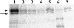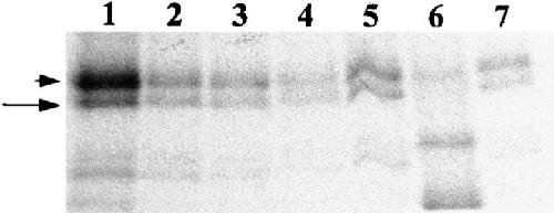 Figure 5. Cell-free translation and membrane insertion of Cx32 mutants. cRNAs for Cx32 wt, (lane 1) and a subset of the nonfunctional Cx32 cysteine mutants (lanes 2–7) were translated in rabbit reticulocyte lysate supplemented with [35S]met and dog pancreatic microsomes (Zhang et al., 1996). Microsomal pellets were isolated and then washed in Na2CO3 to remove accessory and lumenal proteins before solubilization for SDS-PAGE and autoradiography. Cx32 wt and all mutants, except Cx32 (E1:C1−2); (lane 6), produced two major bands corresponding to full-length Cx32 and a truncated form arising from cleavage at a cryptic signal peptidase site (Falk et al., 1994; Zhang et al., 1996), indicating insertion of all products into the membrane. Lower molecular weight products that are likely to be the result of internal initiation or premature termination of translation are evident in all translations. Cx32 (E1:C1−2) (lane 6) produces less full-length product and a major lower molecular weight product distinct from other constructs. Samples shown are: wt Cx32 (lane 1), Cx32 (E2:C1−1) (lane 2), Cx32 (E2:C3+1) (lane 3), Cx32 (E2:C1−2) (lane 4), Cx32 (E2:C1−3/C3+3) (lane 5), Cx32 (E1:C1−2) (lane 6) and Cx32 (E1:C3+2) (lane 7). |