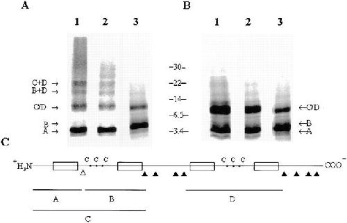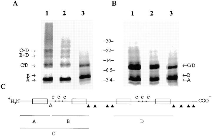 Figure 6. In vitro analysis of disulfide formation in WT and mutant Cx32. Nonreducing (A), and reducing (B) SDS-PAGE were used to dissect disulfide formation in Cx32 wt (A and B, lanes 1), functional paired mutants [Cx32 (E1:C3+2/E2:C1−2): A and B, lanes 2], and nonfunctional single mutants [Cx32 (E2:C1−2) in A and B, lanes 3) produced by the cell-free translation/microsomal translocation system (Zhang et al., 1996). Full-length products were digested with trypsin albumenally (exposed sites based on wt topology are indicated by solid arrowheads in C). In combination with the cryptic activity of signal peptidase (open arrowhead), this should yield fragments A–D as indicated in C. Products were then analyzed on nonreducing (A) or reducing (B) SDS–polyacrylamide gels, with the predicted mobilities of each fragment indicated. Wt and both mutants yielded the same predicted profile under reducing conditions (B), indicating a similar topology in all cases. This pattern did not change for the nonfunctional mutant under nonreducing conditions (A, lane 3). In contrast, both wt and functional mutants yield higher molecular weight products under nonreducing conditions, consistent with disulfide formation between the loops (A, lanes 1 and 2). |