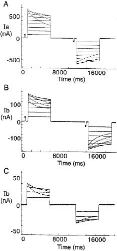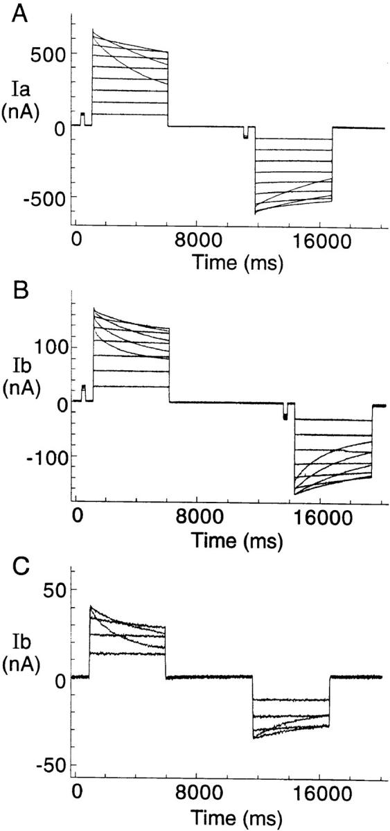 Figure 7. Current traces of wt and mutant Cx32 channels express in Xenopus oocyte pairs. As a test of the degree to which mutant Cx32 channels reproduced the wt channel phenotype, transjunctional currents in response to applied transjunctional voltage steps from −100 to +100 mV in 10-mV (A and B) or 20-mV (C) increments were recorded in the paired Xenopus oocyte system. Oocytes were initially clamped at −40 mV. 3 min was allowed for recovery between pulses. Responses of the wt channels (A) were essentially indistinguishable in kinetics and sensitivity to voltage from either heterotypic pairings of Cx32 wt and Cx32 (E1:C3+2/ E2:C1−2) (B) or homotypic pairing of Cx32 (E1:C3+2/ E2:C1−2). However, progressive decreases in the absolute conductance level of the mutant were typically observed. Similar results were obtained with other functional mutants listed in Figs. 3 and 4. |