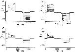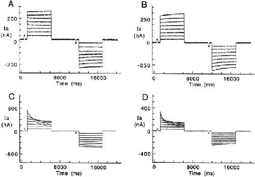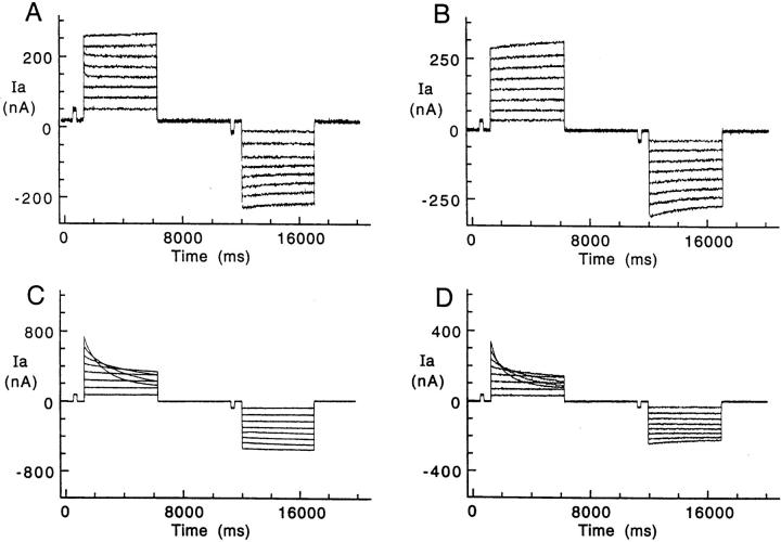 Figure 8. Current traces of Cx32 mutants E2-2 and E1-2/E2-2 paired with an oocyte expressing the endogenous connexin (XeCx38). Shown are plots of current (nA) versus time (ms) for oocyte pairs injected with Cx32 (E2:C1−2): water (A and C), and Cx32 (E1:C1−2/E2:C1−2): water (B and D). Currents are in response to 20-s transjunctional voltage steps from −110 to +110 mV in 20-mV increments. The majority of records obtained show little or no response of junctional currents to transjunctional voltage gradients in this range (A and B). In one experiment, a markedly asymmetric response was noted for both mutants (C and D). One side remained voltage insensitive, but when the XeCx38- expressing cell was relatively positive, a fast and sensitive voltage response was seen analogous to that of XeCx38 homotypic channels. |