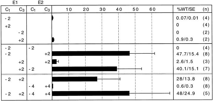 Figure 4. Functional analysis of paired movements of cysteines 1 and 3 between E1 and E2 of Cx32. Movements of one or both of cysteines 1 and 3 in E1 were combined in several permutations with equivalent movements of cysteines in E2 as indicated. Functional analysis in the paired oocyte expression system was as described in Fig. 3, with mutant Cx32 wt coupling expressed as a percentage of Cx32 wt/Cx32 wt coupling. The mean percent coupling/standard error and the number of experiments (n) are shown on the right. Interloop pairings of both C1s or both C3s failed to couple, but movements of C1 in one loop and C3 in the other consistently gave equal or better coupling than the intraloop pairings. As with the movements within a loop, a periodicity of two was evident in the functional mutants. Note that the minimally functional E2:C1−4/C3+4 mutant was rescued when combined with E1:C1−2/C3+2. |