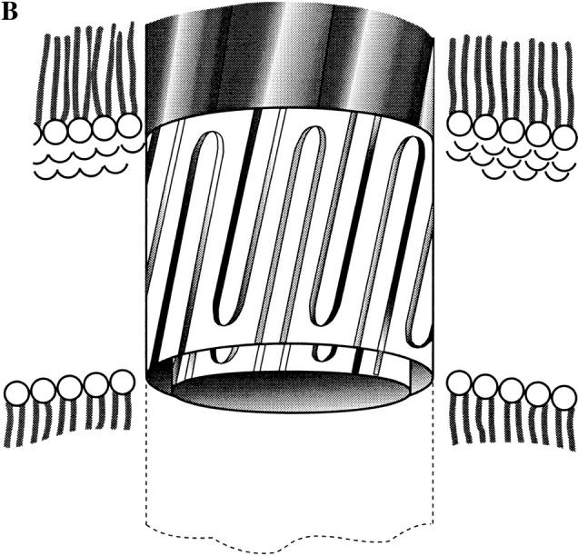 Figure 9. Proposed model of the extracellular loop regions of a connexin. (A) Based on the observations presented here, E1 and E2 form stacked, antiparallel β sheets connected by three disulfide bonds, although the bond between the 2 and 2′ cysteines is not directly demonstrated here. The model accounts for the periodicity of cysteine movements between loops that rescue coupling, and how movements of the first and third cysteines within a loop could be accommodated by a change in the orientation of the interloop disulfides, or a sliding of the loops with respect to one another. Equivalent loops from the connexins of the apposed hemichannel are hypothesized to interdigitate in front of and behind the stacked loops shown. Conserved residues are indicated based on alignments of all vertebrate connexins. Filled circles indicate hydrophobic character, and open circles indicate hydrophilic character. Half-filled circles indicate that either no consensus of hydrophilic or hydrophobic residues exists at this location, or the conserved residue at that location has an amphipathic character (e.g., Y). Specific residues are only indicated when at least 14 of the 17 aligned sequences were identical at that position. (B) An artist's impression of the β zip model of how the loops of individual connexins could interdigitate to form a β barrel extension of the gap junction channel at the docking interface between hemichannels. Concentric barrels, according to the model shown in A, would be held together by disulfides and are shown extending from the connexin subunits within the membrane into the extracellular space separating the cells. The loops have been shown with an arbitrary tilt to the perpendicular axis of the barrel, consistent with other known β barrel structures. |