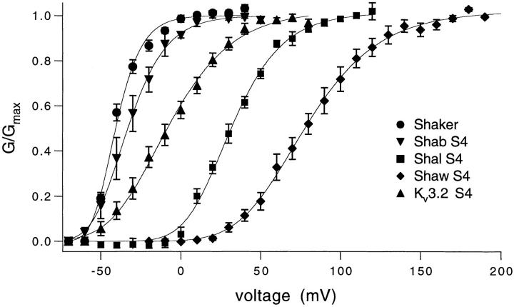 Charged residues in the S4 transmembrane segment of voltage-gated cation channels play a key role in opening channels in response to changes in voltage across the cell membrane. However, the molecular mechanism of channel activation is not well understood. To learn more about the role of the S4 in channel gating, we constructed chimeras in which S4 segments from several divergent potassium channels, Shab, Shal, Shaw, and Kv3.2, were inserted into a Shaker potassium channel background. These S4 donor channels have distinctly different voltage-dependent gating properties and S4 amino acid sequences. None of the S4 chimeras have the gating behavior of their respective S4 donor channels. The conductance-voltage relations of all S4 chimeras are shifted to more positive voltages and the slopes are decreased. There is no consistent correlation between the nominal charge content of the S4 and the slope of the conductance-voltage relation, suggesting that the mutations introduced by the S4 chimeras may alter cooperative interactions in the gating process. We compared the gating behavior of the Shaw S4 chimera with its parent channels, Shaker and Shaw, in detail. The Shaw S4 substitution alters activation gating profoundly without introducing obvious changes in other channel functions. Analysis of the voltage-dependent gating kinetics suggests that the dominant effect of the Shaw S4 substitution is to alter a single cooperative transition late in the activation pathway, making it rate limiting. This interpretation is supported further by studies of channels assembled from tandem heterodimer constructs with both Shaker and Shaw S4 subunits. Activation gating in the heterodimer channels can be predicted from the properties of the homotetrameric channels only if it is assumed that the mutations alter a cooperative transition in the activation pathway rather than independent transitions.