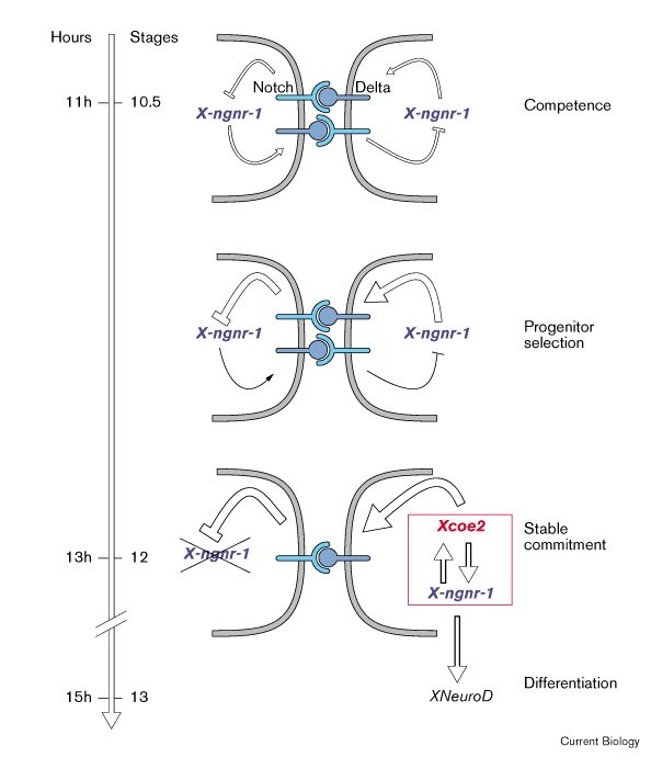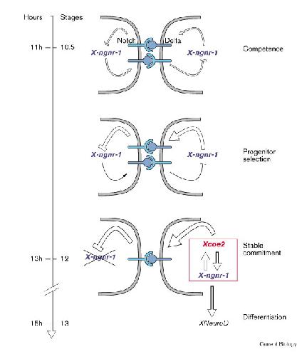 Figure 7. Model for the transcriptional interactions controlling the specification of primary neurons in Xenopus. X-ngnr-1, Xcoe2 and XNeuroD are sequentially activated in primary neuron progenitors. Expression of X-ngnr-1 renders cells competent to adopt a neural fate [10]. Expression of X-Ngnr-1 above a certain threshold leads to activation of Xcoe2 in selected progenitor cells. XCoe2 activity is required for stable commitment of these cells to a neural fate via the maintenance of Deltaotch signalling and a positive-feedback regulation of X-ngnr-1 expression. XCoe2 is also required for the expression of differentiation genes such as XNeuroD. Whether this activation is direct or is through the maintenance of high levels of X-ngnr-1 expression, or both, remains to be determined. The time window between activation of Xcoe2 and XNeuroD, at stages 12 and 13.5, respectively, during which the majority of primary neurons are in the last G2 phase preceding their exit from the mitotic cycle [1], might allow neuron progenitors to respond to spatially and temporally regulated environmental cues.