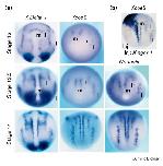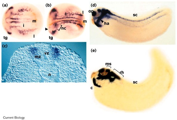 Figure 2. Xcoe2 mRNA expression during Xenopus development, revealed by whole-mount in situ hybridisation. Embryos at stages (a) 14, (b) 17, (c,d) 28 and (e) 32 are shown. Anterior is to the left; (a,b) dorsal view; (d,e) lateral view. The three stripes of primary neuron precursors, medial (m), intermediate (i) and lateral (l) and the trigeminal ganglia (tg), are indicated. In (b), the positions of nascent olfactory placodes (op; arrowhead) and anterior neural crest cells (nc) are also indicated. (c) Transverse section at the level of the spinal cord (sc). Xcoe2 expression is restricted to differentiating neurons in the marginal zone. This expression is still observed at stage 28 (d) but no longer at stage 32 (e). Other abbreviations: c, cartilage; ha, hyoid arch; ms, mesencephalon; mz, marginal zone; n, notocord; rh, rhombencephalon; vz, ventricular zone. |