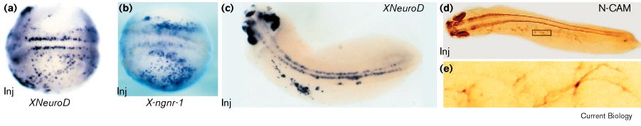 Figure 5. Induction of ectopic neurogenesis by injection of Xcoe2 mRNA. Ectopic neurogenesis was visualised by whole-mount in situ hybridisation using either (a,c)XNeuroD or (b)X-ngnr-1 probes on embryos at (a,b) stage 15 and (c) stage 25 or (d,e) immunostaining stage 30 embryos with anti-N-CAM antibodies. Embryos were microinjected with Xcoe2 (400 pg) and lacZ (50 pg) mRNAs on one side (inj), and the other side was used as a control. An enlargement of the box in (d) is shown in (e). |