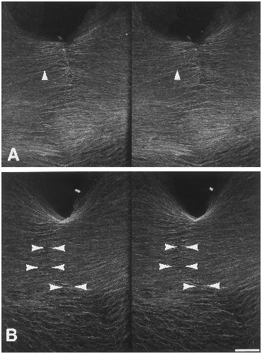 FIG. 1. Microtubule bundles in cleavage furrow. Whole-mount confocal scanning microscope views of the cytoplasmic bridge during