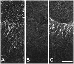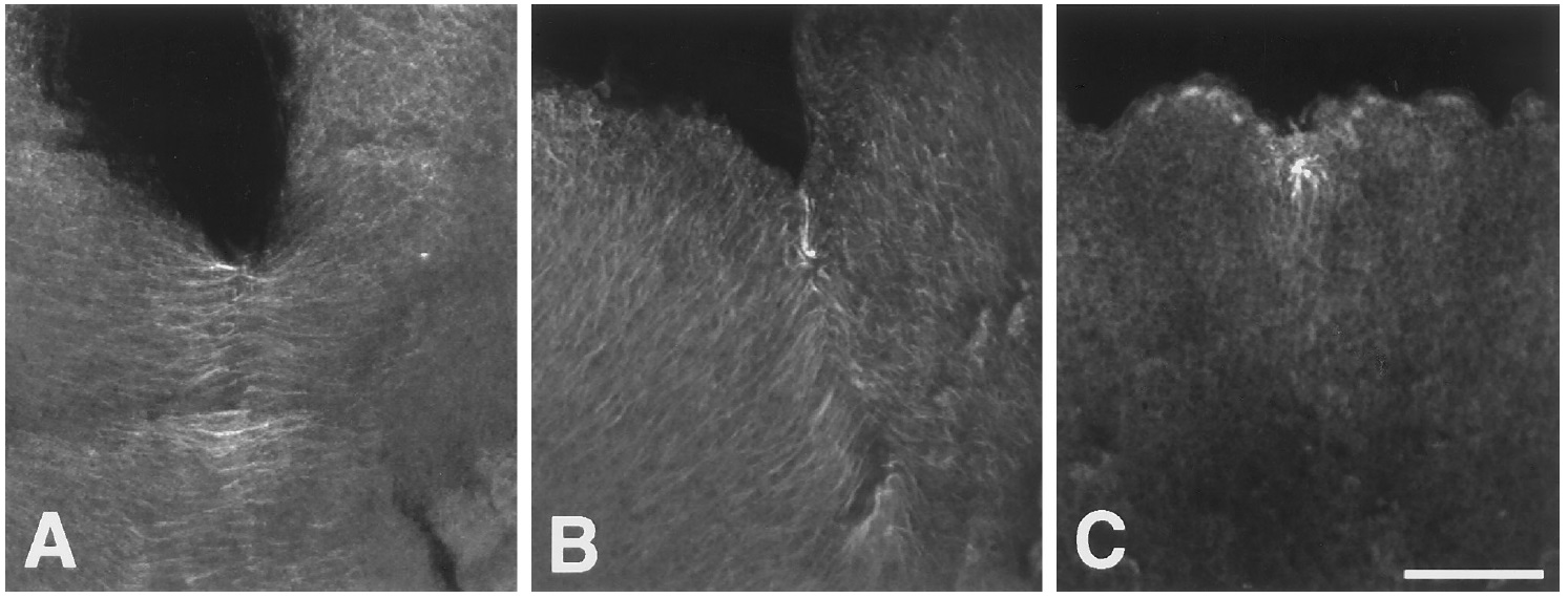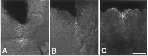 FIG. 14. Whole-mount preparations stained with anti-acetylated tubulin antibody 6-11B-1. (A) 5, (B) 20, and (C) 25 min after appearance