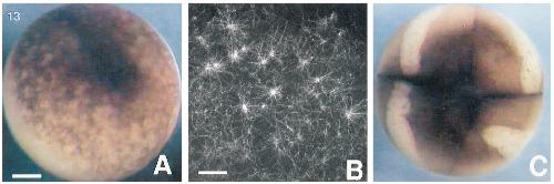 detail of embryo shown in A, showing radial arrangement of microtubule bundles surrounding cytoplasmic bridge. Bar 50 mm. (C)