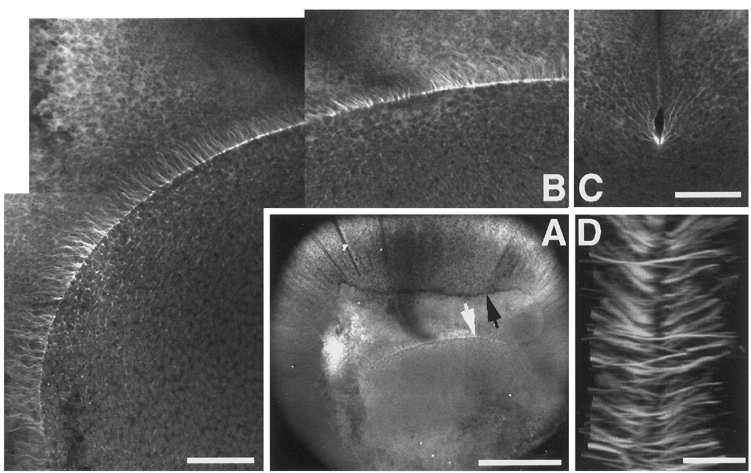 of first cleavage furrow; (D) stage 8 midbodies. Bar 50 um. |