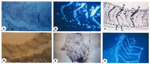 NBT-BCIP procedure, as opposed to sections in A and E, revealed with the 8M purple procedure (cf methods). |