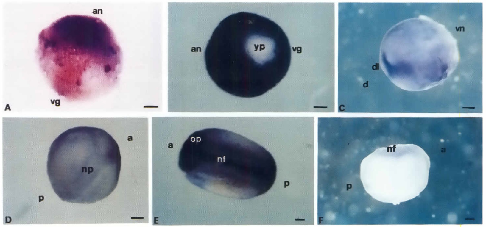 NDPK Xl mANA. IB and E) NDPK X2 mRNA. IC and FI NDPK X3 mANA. a. anterior; an, animal,- d. dorsal; dl, dorsal/lp of the blastopore: nf, neural fold: