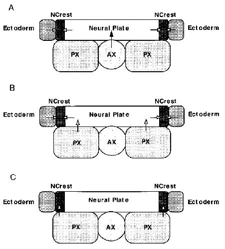 FIG. 6. Model of Xenopus neural crest induction. (A) The underlying axial mesoderm (AX) induces neural plate in ectoderm. Lateral neural plate interacts with the nonneural ectoderm to form neural crest cells in the neural folds region. (B) The underlying paraxial mesoderm