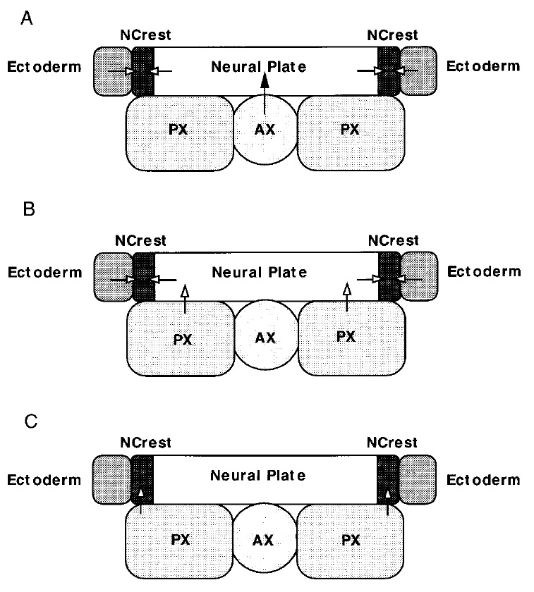 (PX) induces/modifies lateral neural plate. Modified lateral neural plate interacts with the nonneural ectoderm to form neural crest cells in the neural folds region. (C) The underlying PX directly induces neural crest in the overlying cells of the neural folds region.