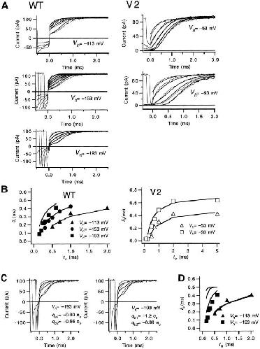 Figure 9. Scheme 2+2′ accounts for WT's and V2's gating currents at hyperpolarized voltages. Simulations are shown for (A) currents induced by voltage steps between −93 mV and more negative voltages (patches w249 and v240) and (B) currents induced by step hyperpolarizations from intermediate prepulse voltages (patches w217 and v417). In B, the duration of the prepulse was 2 and 20 ms for WT and V2, respectively. A short prepulse was used for WT to minimize the contribution of channels in the open state to the gating current time course. |