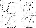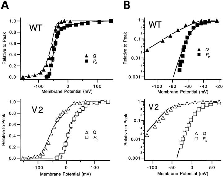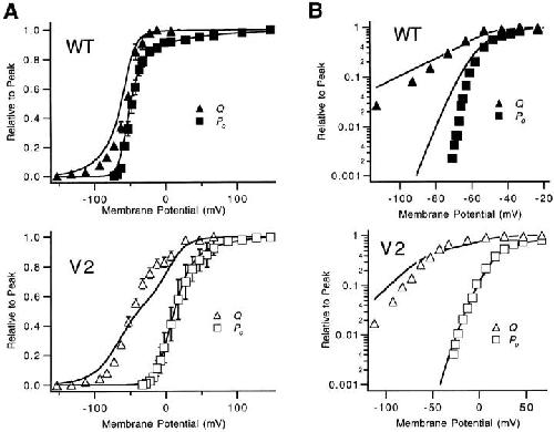 Figure 17. Scheme 3+2′ performs much better than Scheme 2+2′ at predicting certain features of WT's and V2's equilibrium voltage dependence of channel opening and charge movement, including the steepness of V2's Q-V relation and the voltage sensitivity of WT's Po at low Po. As in Fig. 11, plots are shown with ordinates that are linear (A) or log transformed (B). |