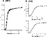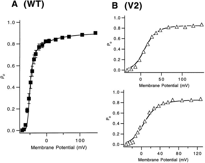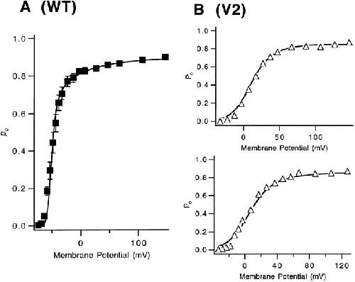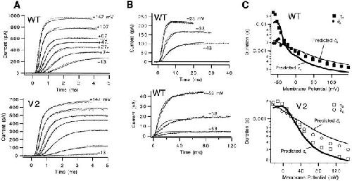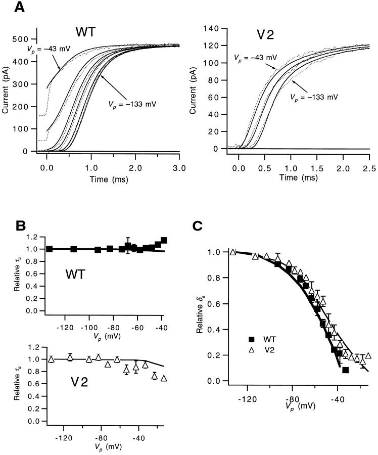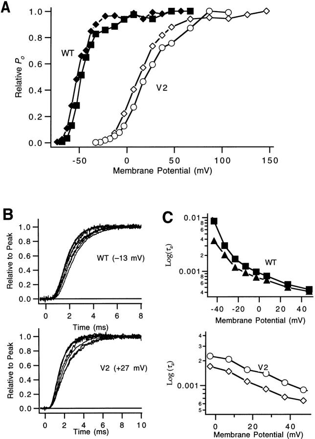 Figure 1. Patch-to-patch variabilities are apparent in WT and V2 voltage dependence of Po (A) and ionic current time courses (B). The Po-V plots were taken from two different patches each for WT and V2, and time courses were taken from seven different patches. The test voltages for the currents in B were −13 and +27 mV for WT and V2, respectively. (C) A comparison of the τa values at different test voltages from two WT and V2 patches shows that the variability in the current kinetics is well accounted for by a simple voltage shift. |