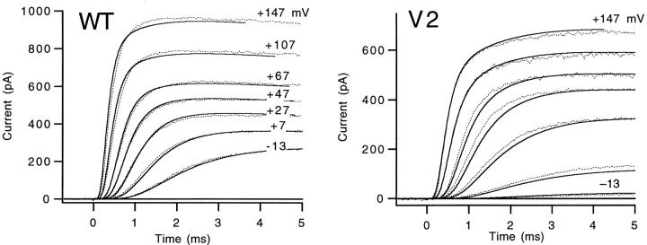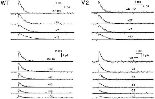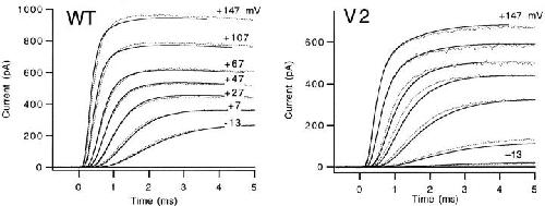 Figure 14. Scheme 3+2′ accounts for WT's and V2's on gating currents across a wide voltage range, between −73 and +47 mV. All current traces come from the same two WT and V2 patches (w212 and v219). Notably, at −33 mV, the model accounts for a slow component that is present in WT's current, but absent in V2's current. The holding potential was −93 mV in these recordings. |