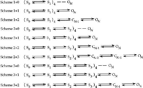 Figure 2. Classes of gating models for Shaker potassium channels. For each model, each of four subunits undergoes one, two, or three transitions between subunit states, designated by S0, S1, etc. In some of the models, the channel undergoes one, two, or three additional concerted transitions. The models are named by the number of subunit transitions and additional concerted transitions. For models with no concerted transitions, the channel is taken to be open after the fourth subunit has undergone the last subunit transition; this is indicated by the dashed line to the open state. |