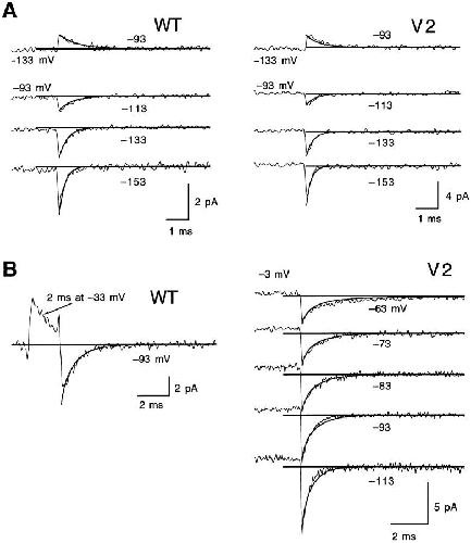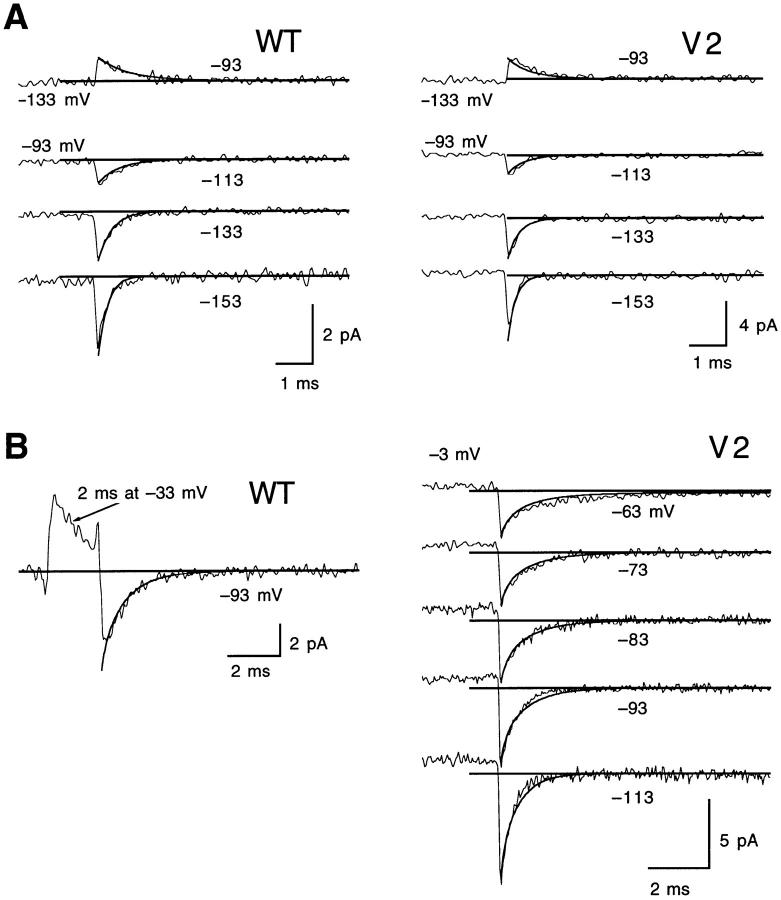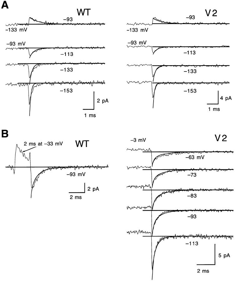 Figure 15. Scheme 3+2′ accounts for WT and V2's gating currents at most hyperpolarized voltages. Simulations are shown for (A) currents induced by voltage steps between −93 mV and more negative voltages, and (B) currents induced by step hyperpolarizations from intermediate prepulse voltages. Data are identical to the traces in Fig. 9. For the most negative test voltage in A (−153 mV), Scheme 3+2′ predicts a current that decays too rapidly, by roughly a factor of 2. This discrepancy reflects the 20% increase in qb1 that was introduced to help achieve a sufficiently large total gating charge (see text). |