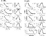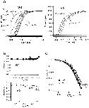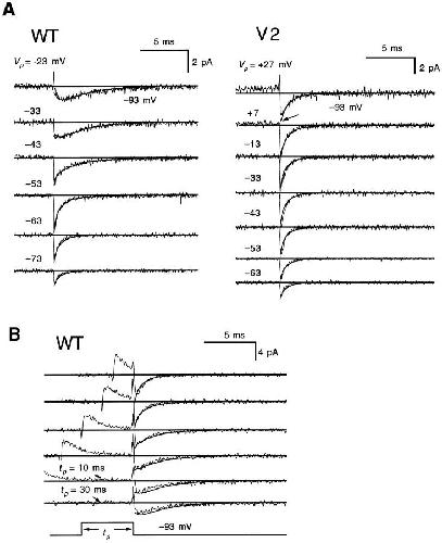Figure 19. Fits of Scheme 3+2′ to WT's and V2's off gating currents after a range of prepulses of different amplitude Vp (A) and different duration tp (B). In B, WT's currents were measured after different prepulses to −33 mV that ranged in duration from 30 to 2 ms (bottom to top). The test voltage for all recordings was −93 mV. For WT's currents, the model accounts for the development of a slowly decaying off current with an increase in the amplitude or duration of the prepulse. The model also accounts for V2's faster off current decay kinetics. The arrow on V2's off current after a prepulse to +27 mV in A marks a small inflection in the simulated current that corresponds to a plateau phase. Data from patches w212 and v219 in A, and patch w217 in B. |