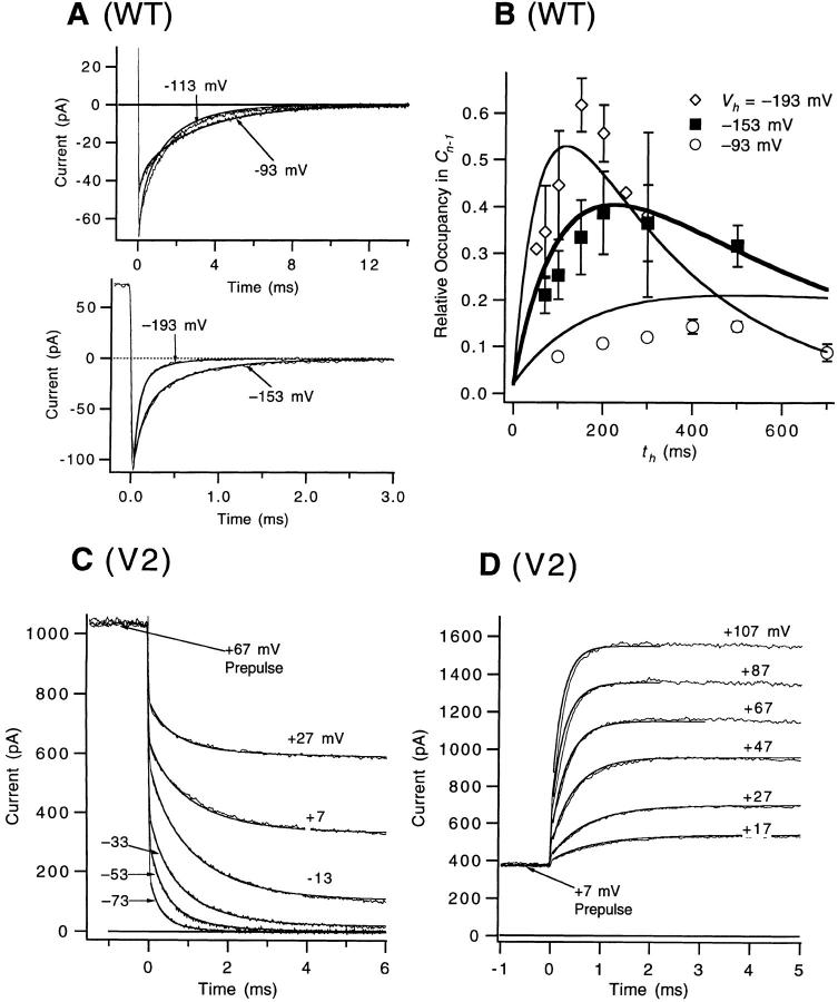 Figure 3. Fits of Scheme 0+2′ to selected WT and V2 macroscopic ionic current time courses that reflect the final transitions. For WT, these include (A) tail currents at voltages between −93 and −193 mV (patch w448), and (B) time-dependent occupancies in the last closed state in the activation path CN-1, derived from reactivation time courses. Occupancies in CN-1 are indicated for hyperpolarizations to voltages Vh = −93, −153, and −193 mV as a function of the hyperpolarization duration th. Occupancy estimates were derived from the amplitude of the fast reactivation component, as described in a previous paper (Schoppa and Sigworth, 1998a), and reflect averages from one to four experiments. In the simulations of these data, we set αN-1 = 0 during the test pulse, or, effectively, βN-2 >> αN-1 at V ≤ −93 mV. Scheme 0+2′ also accounts for (C) V2's macroscopic ionic tail currents at voltages between −73 and +27 mV, and (D) V2's channel opening time courses after a prepulse to +7 mV. In D, the prepulse loads most channels into the last closed states, so that the test currents mostly reflect the kinetics of the final two transitions. All V2 data are from the same patch (v329). |