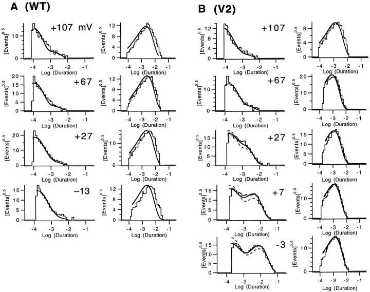 Figure 4. Fits of Scheme 0+2′ to the single-channel closed and open dwell-time histograms at depolarized voltages for WT (A) and V2 (B). For each channel, the closed time histograms are shown on the left, and open times on the right. Solid curves reflect the predictions of Scheme 0+2′ with the values in Table I. The dashed curves on V2's histograms were computed with parameters that are modified from those in Table I in the following way: βN-1(0) was set to 4,400 s−1 and the value αN-1(0) = 300 s−1 was chosen to best fit the closed time histograms. The solid and dashed curves are not always distinguishable. All data are from the same two patches (w265 and v433), except at +107 mV (w266 and v344). |