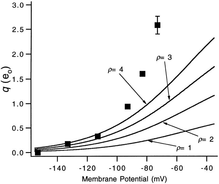Figure 6. The magnitude of the average, absolute charge movement per channel at negative voltages was used to test the “n4” scheme as a model of the first gating transitions. The solid curves were computed from a model assuming a number p of equivalently acting subunits, for which the charge movement q is given by For each curve the charge z1 and midpoint voltage V1 for the transition were fixed to 0.89 and −53 mV, which are the charge and midpoint voltage values of the very first gating transition derived from the kinetic estimates of α1 and β1. The displayed charge values reflect the same data as in Fig. 1 in Schoppa and Sigworth (1998a), except scaled by the estimate of the single channel charge movement q = 12.3 e0 reported in Schoppa et al. (1992). The error bars are smaller than the symbols for most of the values. |
