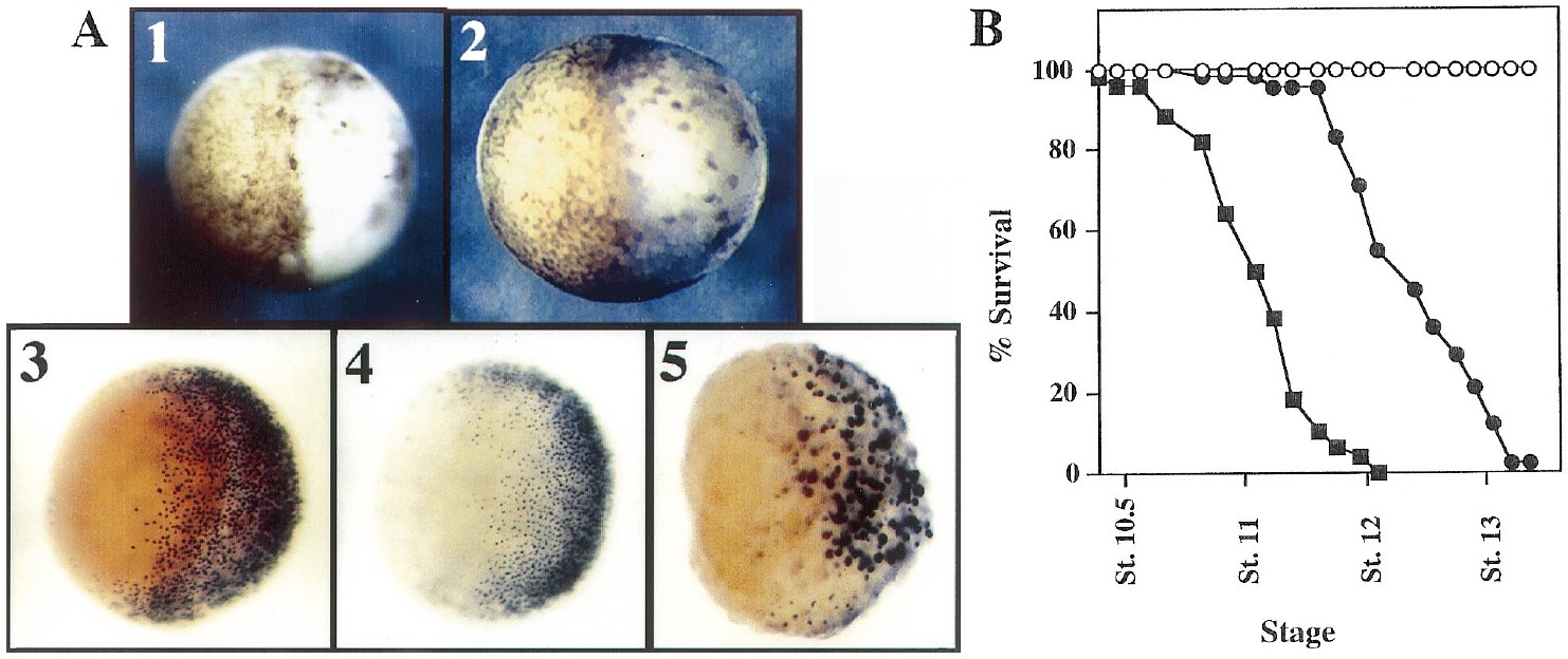 (A) Panels 1 compare a control (right), and irradiated (left) embryo. Embryos were g-irradiated (40 Gy), 1 h post fertilization. Panel 1, St. 2; panel 2, St. 3;