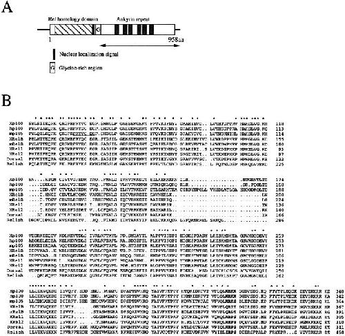 Fig. 1. Structure of the Xenopus p100 NFκB2 protein. (A) Diagram of the domain structure of Xp100. Thick lines indicate the 5â² and 3â² untranslated regions present in the cDNA. An arrow denotes the region used for the probe of whole mount in situ hybridization. (B) Comparison of the amino terminal domain of Xp100 with those of other members of the Rel family. The Xp100 sequence was aligned with those of Rel-related sequences from human p100 (Neri et al., 1991), mouse p105 (Ghosh et al., 1990), Xenopus RelB (Suzuki et al., 1995), Xenopus Rel1/RelA (Kao and Hopwood, 1991; Richardson et al., 1994), Xenopus Rel2 (Tannahill and Wardle, 1995), Drosophila Dorsal (Steward, 1987) and Drosophila Relish (Dushay et al., 1996) in a region spanning the amino-terminal domain of conservation. Identical (*) and conservatively substituted (â ) amino acid residues are indicated. The putative protein kinase A phosphorylation sites and corresponding amino acids are in bold. Degenerate primers used for initial amplification of Xenopus oocyte cDNA were designed based on the underlined sequences of mouse p105.