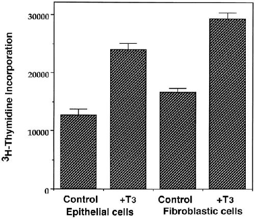Figure 4. T3 stimulates the proliferation of both the intestinal epithelial cells and fibroblasts. Intestinal epithelial cells and fibroblasts were cultured overnight on 96-well plastic dishes (5 × 104 cells/well) in the presence or absence of 100 nM T3. 0.1 μCi of [3H]thymidine was added to the 0.1-ml culture medium/well and incubated for another 5 h. The amount of [3H]thymidine incorporated into genomic DNA was then measured. |
