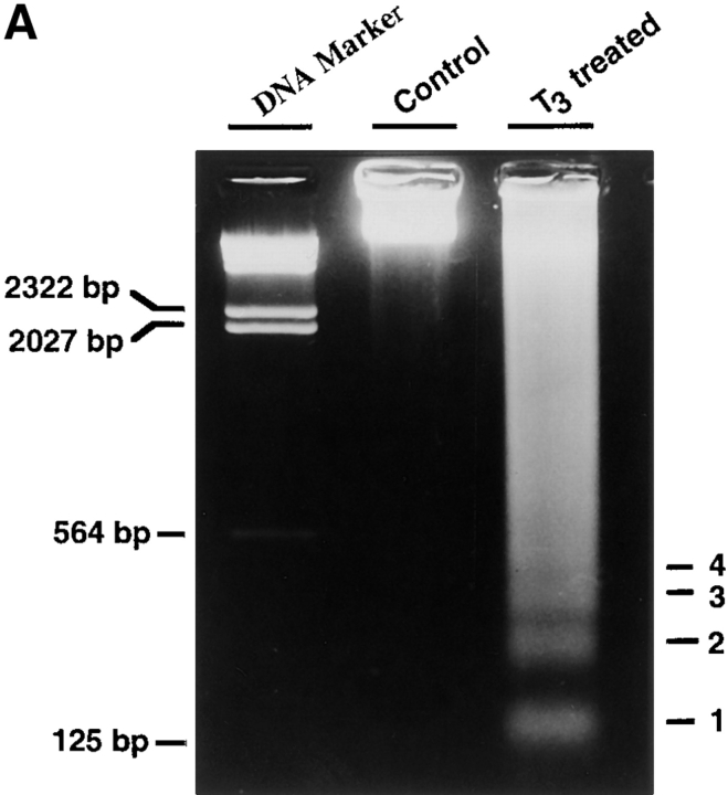 Figure 2. The tadpole intestinal epithelial cells but not the fibroblasts respond to T3 by undergoing programmed cell death. (A) T3-treatment of epithelial cells resulted in the formation of a nucleosome-sized DNA ladder. The epithelial cells were cultured on plastic dishes in the absence (Control) or presence (T3 treated) of 100 nM T3 for 1 d. The genomic DNA was isolated, electrophoresed on an agarose gel, stained with ethidium bromide, and visualized under ultraviolet light. The DNA bands equivalent to the lengths of the DNA in 1â4 nucleosomes were labeled on the right. (B) T3 induces dose-dependent DNA fragmentation in the tadpole intestinal epithelial cells. The epithelial cells were cultured on plastic dishes in the presence of different concentrations of T3 for 3 d and then DNA fragmentation was measured using the ELISA methods. Note that DNA fragmentation was detectible with as low as 5â10 nM of T3, similar to that in the plasma during metamorphosis (Leloup and Buscaglia, 1977), and plateaued at 100 nM T3. (C) Kinetics of T3-induced epithelial cell DNA fragmentation. The intestinal epithelial cells were cultured in the presence of 100 nM T3 for 1â5 d and then DNA fragmentation was analyzed with the ELISA method. Note that DNA fragmentation reached the maximum after 3 or 4 d of treatment. (D) T3 induces DNA fragmentation in the epithelial cells but not the fibroblasts. Intestinal epithelial cells and fibroblasts were isolated and cultured on 96-well plastic dishes (2 Ã 104 cells/well) for 1 or 3 d in the presence or absence of 100 nM T3. DNA fragmentation was then determined by using the ELISA method. |