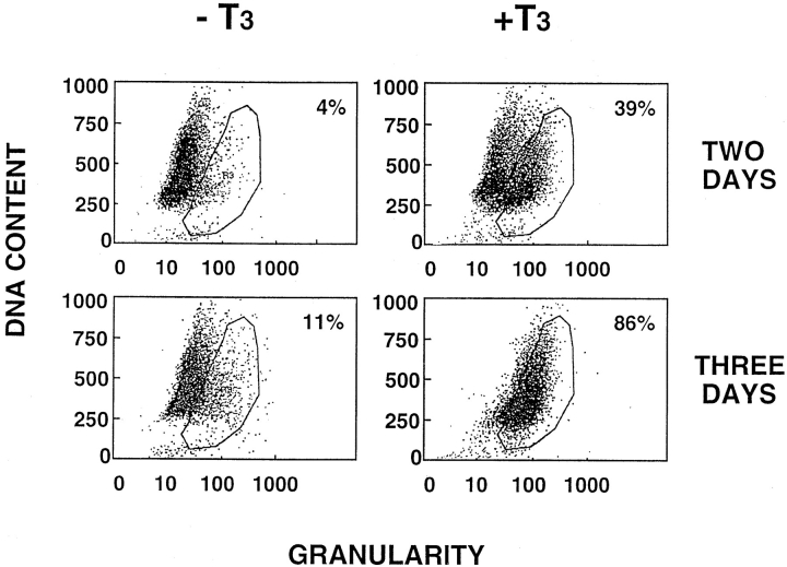 Figure 3. Flow cytometry analysis indicates that epithelial cells undergo apoptosis in response to T3 at different stages of the cell cycle. The epithelial cells were cultured in the presence or absence of 100 nM T3 for 2 or 3 d. The cells were then analyzed by flow cytometry. Although the exact boundary between the live cells and apoptotic cells (encircled area) was difficult to determine with precision, the results clearly showed that cells with different DNA contents or at different cell cycle stages (G2 at the top and G1 at the bottom) were present in the apoptotic region (reflected by the increased cellular granularity). Note that after 3 d of treatment, essentially all cells were in the apoptotic region, and were shown to be dead by trypan blue staining and DNA fragmentation (Figs. 1 and 2). |