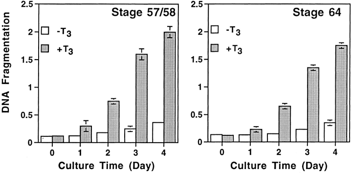 Figure 6. Both larval and adult intestinal cells undergo apoptosis upon T3 treatment in vitro. Cells were dissociated from intestine of stage 57/58 or 64 tadpoles and all of the cells were cultured together in vitro in the presence or absence of 100 nM T3. Cell death was analyzed by using the DNA fragmentation ELISA assay. The cells were predominantly epithelial but a higher portion of mesenchymal cells were present in stage 64 tadpole intestine (McAvoy and Dixon, 1977; Ishizuya-Oka and Shimozawa, 1987a). Note that cell death were detected for both the larval and adult intestinal cells. Slightly lower levels of T3-induced DNA fragmentation were observed at stage 64, probably reflecting the presence of a slightly higher percentage of nonepithelial cells. |