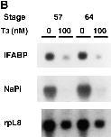 Figure 5. T3 treatment of intestinal epithelial cells leads to the downregulation of two known epithelial specific genes. (A) Kinetics of the downregulation of IFABP gene by T3 in vitro. Epithelial cells from stage 57/58 tadpole intestine were cultured on plastic dishes in the presence of 100 nM T3 for indicated numbers of hours and then RNA was isolated for Northern blot analysis of IFABP mRNA. (B) Regulation of IFABP and Na+/ PO43− cotransporter genes by T3 in vitro. Epithelial cells from stage 57/58 or stage 64 tadpoles were isolated and cultured on plastic dishes in the presence or absence of 100 nM T3 for 1 d. The RNA was isolated and analyzed by Northern blot hybridization with the cDNA probes for IFABP and intestinal Na+/PO43− cotransporter (NaPi). Note that both genes were downregulated in the stage 57/58 epithelial cells as expected from their expression during normal development (Shi and Hayes, 1994; Ishizuya-Oka et al., 1994, 1997). However, their downregulation in stage 64 epithelial cells appeared to contradict with expectation (see text for discussion). The hybridization with rpL8 served as a loading control. |