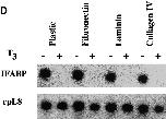 Figure 8. Epithelial cells from stage 57/58 intestine cultured on matrix-coated dishes are more resistant to T3-induced apoptosis, but are similarly stimulated by T3 to proliferate or downregulate IFABP expression. (A) Intestinal epithelial cells were cultured on plastic dishes with or without indicated coatings for 1–3 d in the presence or absence of 100 nM T3. DNA fragmentation was then measured by the ELISA method. (B) Epithelial cells cultured on various matrix-coated dishes have a similar dose response to T3 treatment in spite of their increased resistance to T3-induced cell death. The epithelial cells were cultured on various dishes in the presence of different concentrations of T3 for 3 d and then DNA fragmentation was then determined by the ELISA method. (C) Epithelial cells were cultured overnight on various matrix-coated dishes in the presence or absence of 100 nM T3 (5 × 104 cells/well). 0.1 μCi of [3H]thymidine were added into the 1-ml culture medium/well and then incubated for another 5 h. [3H]thymidine incorporated into genomic DNA was then measured. (D) Epithelial cells were cultured on matrix-coated dishes in the presence or absence of 100 nM T3 for 1 d and then total RNA was isolated for Northern blot analysis of IFABP mRNA. The hybridization with rpL8 served as a control. |