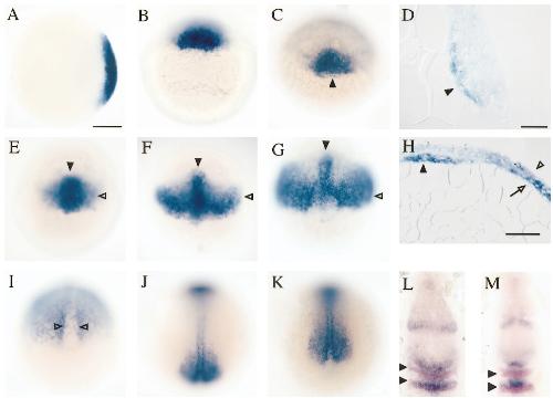 the embryonic shield (arrowhead). D is a sagittal section through the shield at 50% epiboly. (E–H) As gastrulation proceeded, expression