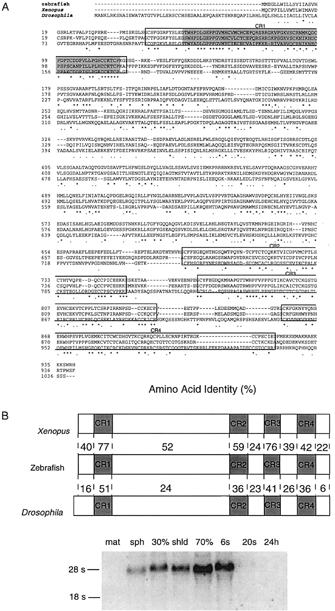 FIG. 1. Sequence conservation and expression of zebrafish chordin. (A) The alignment compares the amino acid sequence of zebrafish