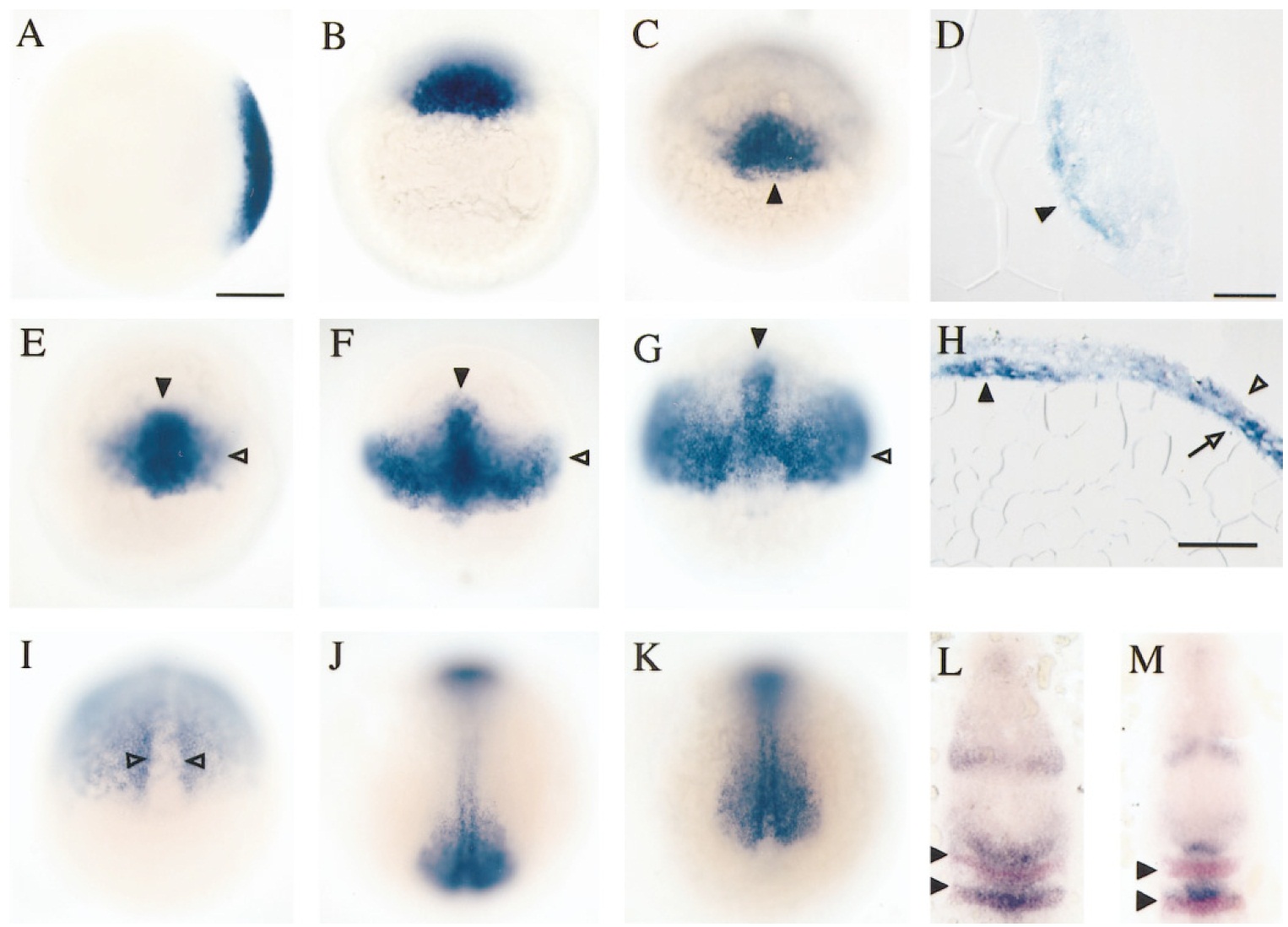 was found transiently in the axis (arrowhead) and new bilateral domains of expression appeared (open arrowhead) in all superficial