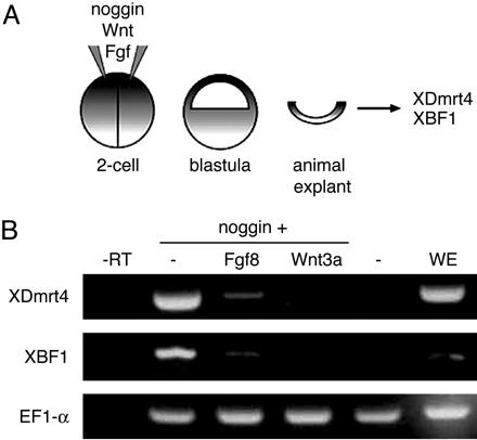 Signaling pathways involved in inducing XDmrt4. (A) Two-cell stage embryos are injected in both blastomeres with a combination of Noggin, Wnt3a, and Fgf8 mRNAs. Animal explants are dissected at the blastula stage, cultured until neurula stage, and analyzed by RT-PCR for expression of XDmrt4 and XBF1. (B) Noggin induces strong expression of XDmrt4 and XBF1. Coinjection of Fgf8 or Wnt3a severely reduces Noggin-mediated XDmrt4 and XBF1 induction. Controls include uninjected animal explant (–), whole embryo (WE) at stage 17, and reaction minus reverse transcriptase (–RT). Elongation factor 1α is used as a loading control. |