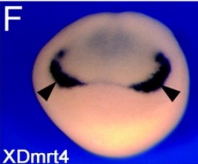 dmrt4 (DMRT like family A1) gene expression gene expression in Xenopus laevis embryo, assayed via in situ hybridization, NF stage 28, lateral view, anterior right, dorsal up.