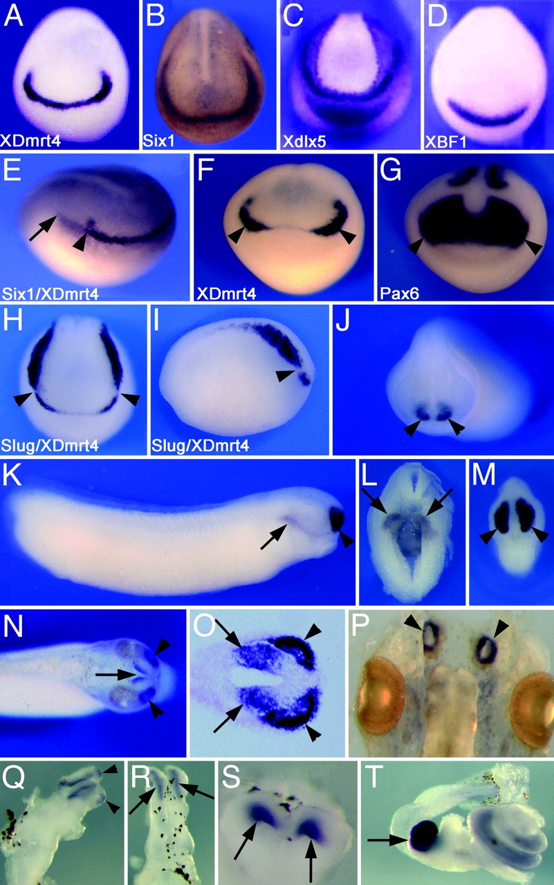 Fig. 1. Developmental expression of XDmrt4 by whole-mount in situ hybridization. (A) XDmrt4 expression at the early neurula stage is detected at the anterior edge of the neural plate. (BâD) Six1 (B), Xdlx5 (C), and XBF1 (D) expression at a similar stage are shown for comparison. (E) Early neurula stage embryo stained with both XDmrt4 and Six1 probes show that XDmrt4 is expressed in a subdomain of the preplacodal ectoderm. The arrowhead indicates the posterior boundary of XDmrt4, and the arrow marks the posterior domain of Six1. (F and G) Comparison of XDmrt4 (F) and Pax6 (G) expression in sibling embryos illustrates that both genes are expressed in the presumptive olfactory placode (arrowheads). (H and I) Double in situ hybridization showing the relationship of the expression domain of the neural crest-specific gene Slug and XDmrt4 at stage 17. The arrowheads indicate the posterior and anterior boundary of XDmrt4 and Slug, respectively. Views are dorsal-anterior (AâD and FâH) and lateral (E and I, anterior to right). (J) At stage 23, XDmrt4 is detected bilaterally in the prospective nasal placode (arrowheads), anterior view. (KâM) By stages 29/30 XDmrt4 is strongly detected in the developing olfactory organ and the telencephalon (arrowheads). At this stage XDmrt4 is also detected in the foregut (arrows, K and L). Lateral (K) and anterior (M) views, dorsal to top. (L) Transverse section. (N and O) In stage-35 embryos XDmrt4 expression domains in the telencephalon (arrows) and the olfactory organ (arrowheads) are segregated. (N) Dorsal view, anterior to right. (O) Longitudinal section through the olfactory epithelium and the telencephalon. (PâS) At stage 45, XDmrt4 expression persists in the olfactory epithelium (arrowheads, P), the olfactory bulb (arrowheads, Q), and forebrain (arrows, R and S). Whole-brain lateral (Q) and dorsal (R) views. (S) Transverse section through the forebrain. (T) XDmrt4 is also strongly expressed in the gall bladder (arrow) and more diffusely throughout the intestine. (Magnifications: Ã10 in AâD, H, and I; Ã12 in E, F, and JâN; Ã20 in O and S; and Ã15 in P, Q, and T.) |